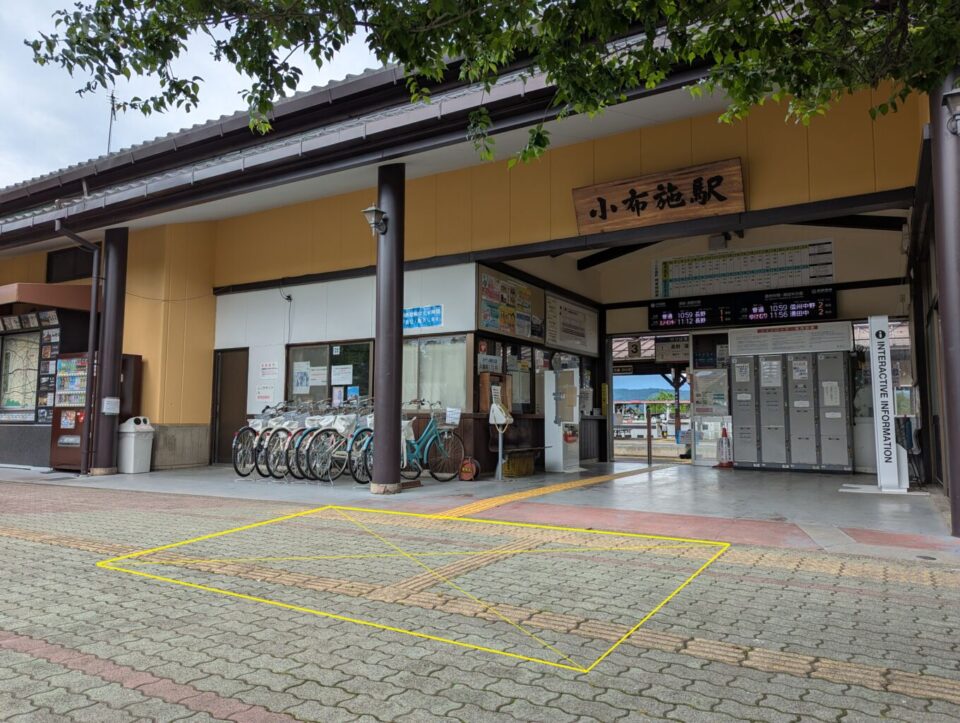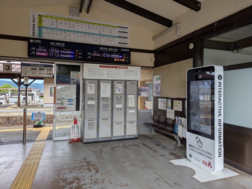 Obuse Station is a small, easy-to-navigate station on the Nagano Electric Railway (Nagaden) line. The station is staffed and has one side platform plus one island platform serving three tracks. Coin lockers are often available at the station, though sizes and fees vary. Tourist information is available next to Obuse Station, and the main town area is about a 10-minute walk away.